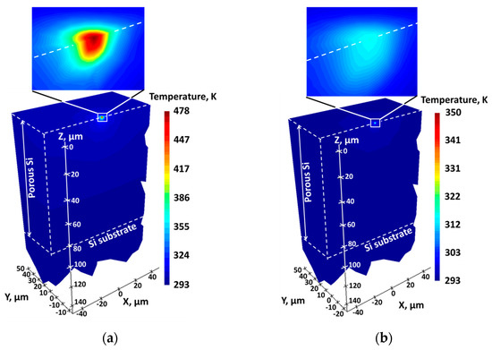 In order to estimate thermal conductivities of porous Si layers and porous Si/hexadecane composites, laser-induced thermal gradients in the porous Si without and with hexadecane were simulated and illustrated in Figure 3a,b, respectively.