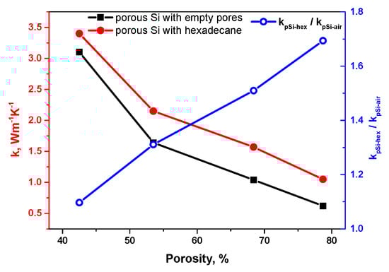 As one can see, the thermal conductivity values monotonously decrease for both cases. At the same time, the thermal conductivity values characterizing the porous Si/hexadecane composites (kpSi−hex) are systematically higher, compared to the values for the porous Si layers with empty pores (kpSi−air).