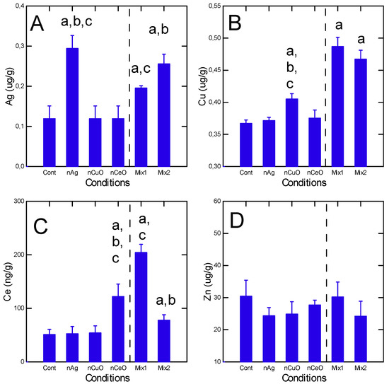 Figure 1. Metal uptake in fish exposed to nanoparticles and mixtures. The data represent the mean with the standard error for Ag (A), Cu (B), Ce (C) and Zn (D). The Mix1 consists of 20 µg/L of nAg and nCuO and 5 µg/L of nCeO giving a net concentral of 45 µg/L. The Mix2 consists of 50 µg/L of nAg and nCuO and 10 µg/L nCeO giving a net concentration of 110 µg/L. The letter a indicates significance relative to controls, b significance relative to Mix1, and c relative to Mix2.