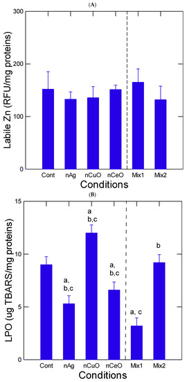 Figure 2. Oxidative stress in the liver of trout exposed to the nanoparticles. Oxidative stress was determined by labile Zn (A), LPO (B) and aCOX (C). The data represent the mean with the standard error. The letter a indicates significance relative to controls, b significance relative to Mix1 and c relative to Mix2.