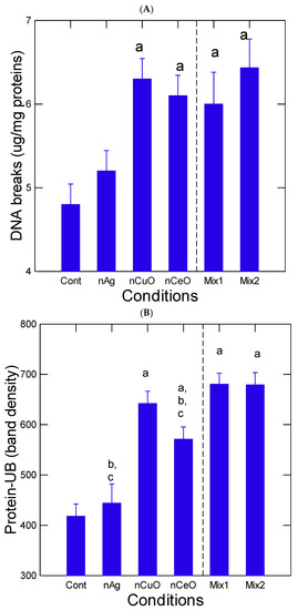 Figure 3. Hepatic DNA and protein damage in trout exposed to the nanoparticles. The data represent the mean with the standard error for DNA damage (A) and protein-ubiquitin tagging (B). The Mix1 consists of 20 µg/L of nAg and nCuO and 5 µg/L of nCeO giving a net concentral of 37 µg/L. The Mix2 consists of 50 µg/L of nAg and nCuO and 10 µg/L nCeO giving a net concentration of 110 µg/L. The letter a indicates significance relative to controls, b significance relative to Mix1, and c relative to Mix2.