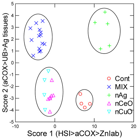 In an attempt to gain a more comprehensive view on the effects of individual nanoparticles and their mixtures in juvenile rainbow trout, a discriminant function analysis was performed (Figure 5). The analysis revealed that the treatment groups were correctly classified with a mean of 71% and 95% of the total variance was explained by the first two component scores. The mixtures 1 and 2 were combined into one mixture group during this analysis and yielded a distinct cluster from the other treatment groups. The control and nAg groups formed distinct clusters while the oxides (nCeO and nCuO) formed one cluster, which was closer to the mixture effects. Factorial analysis revealed that the following biomarkers explained most of the variance: HSI, aCOX, labile Zn, protein-UB, and Ag tissue levels. Based on these results, exposure to nanoparticles single and in mixtures leads to liver enlargement, oxidative stress, and protein damage.