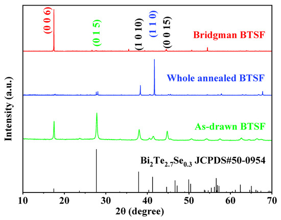 The XRD patterns of as-drawn fiber cores, whole-annealed fiber cores, and Bridgman-annealed fiber cores are exhibited in Figure 1. All the XRD peaks are indexed to the Bi2Te2.7Se0.3 hexagonal phase (JCPDS#50-0954). The as-drawn Bi2Te2.7Se0.3 fiber cores (BTSF) are polycrystals after a process of thermal drawing and quick cooling (>100 °C/s). The average crystal size of as-drawn fiber core is estimated to be ~30 nm based on the XRD peak width and the Scherrer formula [16], and the average particle sizes of post-annealed fiber cores are >100 nm. A great difference is found in XRD peaks among the as-drawn fibers and annealed fibers. The annealed fiber cores show larger XRD peak intensities than the as-drawn fiber cores at special lattice planes, such as (1 1 0) marked in blue or (0 0 6) marked in red. The difference in XRD peak intensities demonstrates that the crystals in annealed fiber cores could possess an orientation over the crystals in as-drawn fiber cores. According to the Lotgering method [6], the orientation degree F of the (0 0 1) planes in polycrystals can be calculated: F = (P − P0) / (1 − P0); P0 = I0(0 0 l) / ∑I0(h k l); P = I(0 0 l) / ∑I(h k l). Hence, the F of the crystals in as-drawn fiber cores and annealed fiber cores are calculated as 0.45, 0.06, and 0.92, respectively. This means that the as-drawn fiber cores and Bridgman-annealed fiber cores are in the (0 0 1) orientation and that the Bridgman-annealed fiber cores show a greater orientation. Oppositely, the whole-annealed fiber cores show a great (1 1 0) orientation when their (110) orientation factor (F(110)~0.85) can be calculated from the data of Figure 1.