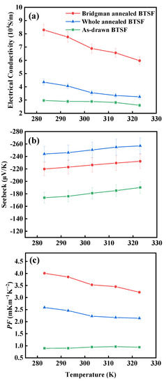 The electrical conductivities (σ) and Seebeck coefficients (S) of the fibers are shown in Figure 4a,b, measured by a home-made setup in our previous work [6]. In Figure 4a, all the as-drawn/annealed fibers possess a decreasing σ with increasing temperature (10–50 °C), revealing the metallic resistance characteristic [21]. The σw of the whole-annealed fibers and the σb of the Bridgman-annealed fibers are higher than the σa of the as-drawn fibers, and the σb is approaching threefold σa at the same temperature. The result could be derived from the fact that the (001) orientation of Bridgman-annealed fibers or the (110) orientation of whole-annealed fibers could enhance σ, and the greater orientation along (001) would support the higher carrier mobility and σ, as reported in our previous work [6]. In Figure 4b, the negative Seebeck coefficient means that all the fibers are n-type conductors [22]. All the as-drawn fibers and the annealed fibers possess an increasing |S| with increasing temperature (10–50 °C). The |Sw| of the whole-annealed fibers is bigger than |Sb| of the Bridgman-annealed fibers and |Sa| of the as-drawn fibers under the same temperature. This could be attributed to the fact that the annealing process could decrease Te enrichment to increase |S|, and the oriented crystals along (110) should exhibit a little higher |S| than the oriented crystals along (001), whose isotropic behavior is following the result of the reported n-type Bi2T3 single crystals [23] or films [24]. The PF = S2σ of all fibers were calculated and shown in Figure 4c. The PFb of the Bridgman-annealed fibers is higher than the PFw of the whole-annealed fibers and the PFa of the as-drawn fibers at the same temperature. The PFb of the Bridgman-annealed fibers exceeds fourfold the PFa, and the highest value is about 4 mW/mK2 at 10 °C.