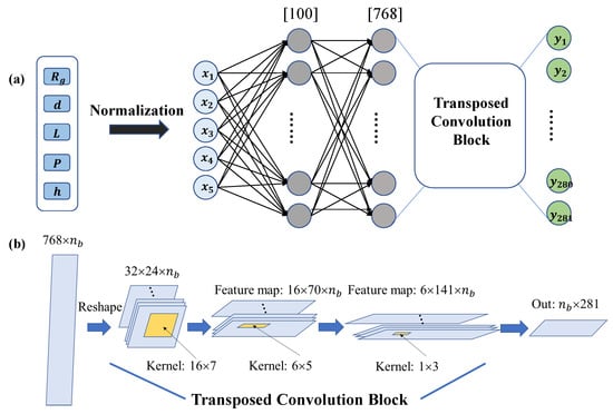 Illustration of forward prediction machine-learning network. (a) The five design parameters are normalized as a 5-dimension vector input for the machine-learning network. The output points correspond to 281 sample points of reflective spectrum in 6–20 GHz. The network consists of two fully connected layers and a transposed convolution block. (b) The working mechanism of transposed convolution block considering batch size in training process with three transposed convolution layers. Here, is the batch size. The kernel size for each layer and feature-map evolution are demonstrated. This block eventually turns information from the second fully connected layer into 281 dimensions’ output which can reproduce the reflective spectrum.