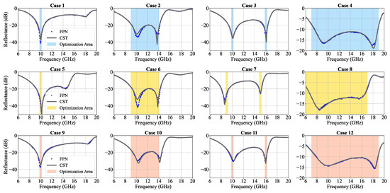 Versatile absorber designs based on different requirements. (The reflectance are shown in logarithmic coordinate) Cases 1–4: inverse design in all five degree of freedom. Cases 5–8: inverse design with thickness of substrate h fixed at 3.5 mm. Cases 9–12: inverse design with sheet resistance of graphene fixed at 250 . The colored area is the optimization area. FPN indicates the optimized reflection spectra given by inverse design system while CST represents the reflection spectra from CST simulations with the optimized parameter combinations.