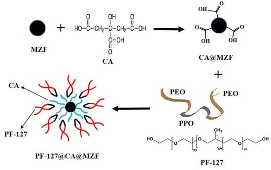 Schematic illustration for the formation of citric acid (CA) and pluronic F127 (PF-127) on the surface of MZF nanoparticles.