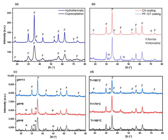X-ray diffraction patterns of pure MZF nanoparticles synthesized (a) with co-precipitation and hydrothermal methods (b) with different coatings of citric acid (CA) and pluronic F-127 (PF-127) (c) at different precipitation pHs and (d) at different hydrothermal temperatures.