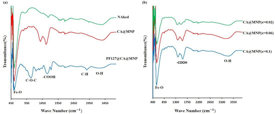 Fourier-transform infrared spectra of (a) naked, citric acid and pluronic F-127 coated MZF and (b) Eu-substituted MZF (x = 0.02, 0.06, 0.10).