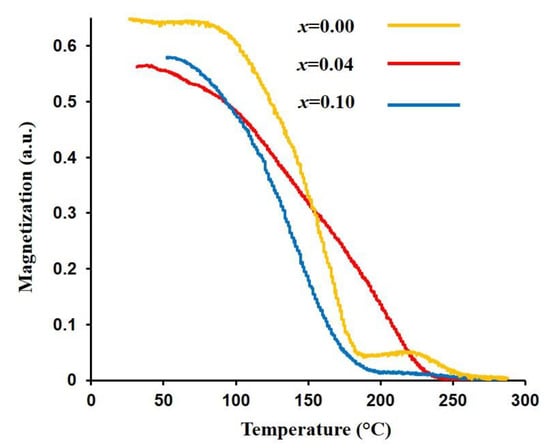 M-T curves for Mn0.6Zn0.4EuxFe2−xO4 (x = 0, 0.04, and 0.1).