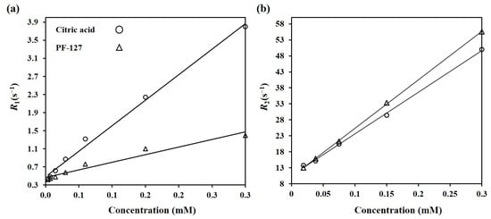 To increase r1 and r2, designing the nanoparticles’ surfaces and consequently, controlling the water accessibility of the magnetic core is a crucial factor. Figure 9a,b illustrate the variation of the relaxation rates R1 and R2 as a function of [Fe+Eu] concentration for citric-acid- and PF-127-coated Mn0.6Zn0.4Eu0.15Fe1.85O4. As can be seen, there are explicitly linear relations between R1 and R2 and concentration for all samples, so the slopes represent the specific r1 and r2 relaxivities. The citric acid coating resulted in a relatively high r1 (note the slope of the R1–concentration fitting curve for the citric-acid-coated sample in Figure 9a), which can be explained by the high hydrophilicity of the small citric acid molecules that increases the accessibility of Eu ions in the EuMZF structure to the surrounding water molecules. By applying the second coating layer of PF-127, r1 decreased from 11.60 to 3.35 mM−1s−1 as a result of the larger hydrodynamic diameter of the PF-127-coated EuMZF rather than the citric-acid-coated one, leading to the reduced accessibility of Eu ions to the hydrogen pool [24]. The low r1 of the PF-127-coated samples can be also related to the lower hydrophilicity and the long chain of PEO–PPO–PEO in PF-127 that limits the permeability of the magnetic core to water molecules. The hydrophilicity is directly related to r1 as it controls the water coordination number and the accessibility of the magnetic core to the water pool. The r2 value for citrate alone and citrate plus PF-127-coated Mn0.6Zn0.4Eu0.15Fe1.85O4 were 130 and 152 mM−1s−1, respectively. For nanoparticles with both coatings, r2 is slightly larger than that for nanoparticles with just a citric acid coating, which might be related to the contribution of PF-127 to T2 relaxation [34].