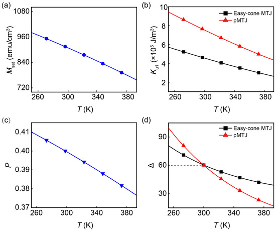 where T is the temperature, and β = 2 × 10−5 K−3/2 is the fitting parameters dependent on materials. Tc = 750 K is the Curie temperature. Msat(0), Ku1(0), and P(0) are the values at T = 0 K. Their values are given in Table 1 so that the corresponding values at T = 300 K are consistent with those reported in [30]. The pMTJ and easy-cone MTJ studied in this work differ only in magnetic anisotropy energy. That is, Msat(0) and P(0) of both devices are the same but the Ku1(0) is different. As for Ku2, previous studies pointed out that the significant Ku2 does not intrinsically originate from the ferromagnetic interfaces. The spatial fluctuations of film thickness and atomic structure at the interface should be responsible for its emergence [31,32,33]. Therefore, we exclude the temperature dependence of Ku2 in this study. As illustrated in Figure 2a–c, all these three parameters decrease as T is increased. The same monotonicity of Msat and Ku1 makes it difficult to directly derive the changes of Δ as the temperature is varied, and we resort to the numerical calculation. The Δ of the easy-cone state is given by [14]: