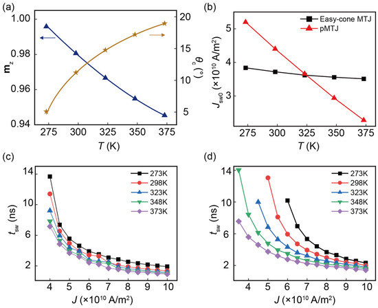 As depicted in Figure 3b, Jsw0 of the easy-cone MTJ and pMTJ will drop as T is increased. In our study, the spin polarization P and Ku1,eff determine Jsw0 when T varies. The reduced Ku1,eff at high temperatures leads to a lower Δ, and consequently a smaller current density is able to realize magnetization switching. In contrast, the reduced P results in a weaker STT, which calls for additional current density to switch the magnetization [36,37,38]. Note that Ku1,eff is more sensitive to temperatures, it is the dominated parameter in the variation of Jsw0. Thus, the Jsw0 curves of both easy-cone MTJ and pMTJ show a downward trend. It is worth noting that the decrease in Jsw0 in pMTJ is steep, while that of the easy-cone MTJ shows a much gradual trend. This is because the variation of Ku1,eff in the pMTJ is more significant. Therefore, compared with the easy-cone MTJ, the pMTJ has a much lower Jsw0 when T is higher than 323 K. However, this is at the cost of its stability under temperature variation. For example, in the range of 273 K to 373 K, Jsw0 of the pMTJ changes by 56%. This value in the easy-cone MTJ is only 8%. In practical applications, this stability is very attractive since it can promise a wider operating temperature range.