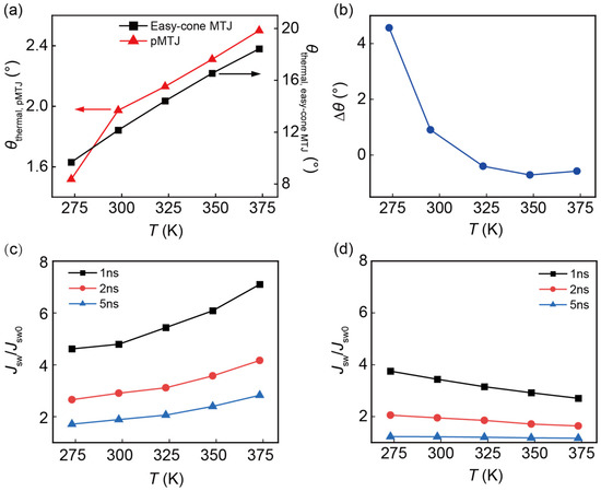 To study the temperature effect, we consider the standard operating temperature range of commercial electronic devices, from 273 K to 343 K. To further verify the superiority of the easy-cone MTJ at higher temperatures, we also perform the simulations at the temperature range of 343–373 K. The results show that the easy-cone MTJ is still superior. Therefore, it can be predicted that the advantages of the easy-cone MTJ will become even more apparent above 373 K. When the temperature is smaller than 273 K, it is hard to obtain the easy-cone state since the first-order anisotropy constant is so large that the anisotropy energy cannot be compensated by the demagnetizing energy. Finally, we determined the temperature region 273–373 K. We consider that the temperature affects the writing performance in two ways. One is the temperature dependence of physical parameters, which dominates the variations of the device performance. The other is the influence of the temperature-dependent Hthermal, which arises from the thermal fluctuations. To investigate the intrinsic writing performance, we firstly exclude the Hthermal. To determine the equilibrium state for the easy-cone MTJ, θc at various temperatures is calculated using Equation (3), which is shown in Figure 3a. Meanwhile, we determine the θc at T = 273 K to T = 373 K using the numerical simulation. The results of the calculation and simulation fit well. It can be seen that the misalignment between the FL and PL will become more pronounced at a higher T. The maximum θc in our simulation reaches 19° at T = 373 K. It has been demonstrated that a larger θc will lead to lower intrinsic switching current density (Jsw0) and switching delay (tsw). Jsw0 is defined as the critical current density above which STT can overcome the damping and magnetization switching will be initialized. A small Jsw0 should be promised to ensure a low-power consumption. For the easy-cone MTJ and pMTJ, Jsw0 is given by Equations (8) and (9), respectively [14,35].