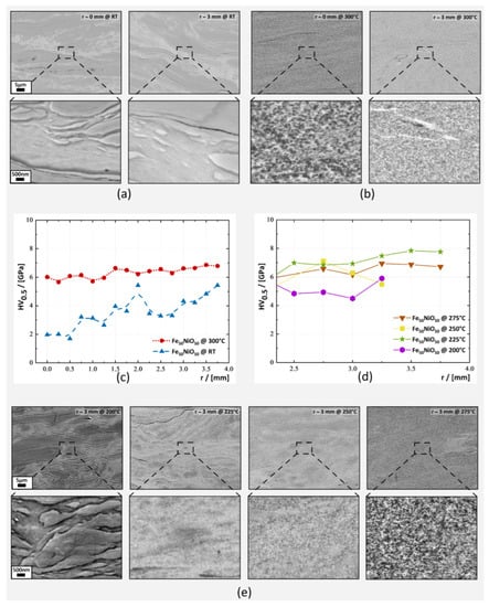 SEM micrographs in BSE mode depict samples deformed at RT (a) and 300 °C (b) at mm and mm. EDX spectroscopy identified the dark phase as NiO for (a) or Fe3O4 for (b). (c) Vickers microhardness of Fe50NiO50 samples along the radial direction. The sample processed at 300 °C had a higher saturation microhardness compared to the sample deformed at RT. (d) Vickers microhardness values form mm to mm. Higher deformation temperatures led to a homogeneous microstructure and therefore higher hardness values. (e) SEM micrographs in BSE mode gained of Fe50NiO50 samples at the outer radii (r∼3 mm). An onset of homogenisation of microstructure could be seen at 225 °C and gradually improved towards 275 °C. The micron bar applies to all micrographs in the same row.