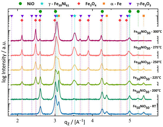The quality of the XRD patterns and similarity of Fe3O4 and maghemite (-Fe2O3) patterns allowed a determination of FexOy phase only at higher qz ≥ 3.5 Å. The peaks at qz = 3.889 Å and qz = 4.235 Å, for example, are in accordance with the Fe3O4 pattern. Presence of -Fe2O3 could not be excluded, but apparently Fe3O4 dominated the XRD-pattern; -Fe2O3 was therefore omitted in the following consideration for the Fe50NiO50 nanocomposite.
