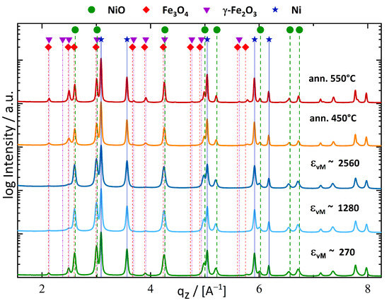 Synchrotron WAXS results are shown for different applied strains of the Fe10Ni40NiO50 sample. Starting from bottom: ∼270, ∼1280 and ∼2560. The two annealed samples are at the top: atop the sample annealed at 550 °C and below the sample annealed at 450 °C. At low q-values the development of -Fe2O3 peaks were visible. -Fe2O3-peaks became weaker with high applied strains due to a reduction of CSDS.