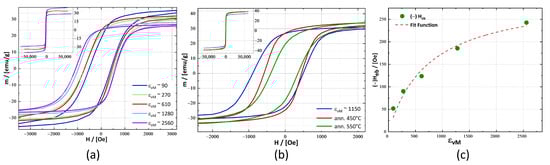 Figure 6b shows hysteresis loops of the annealed samples at 8 K. The annealing treatment caused a drastic reduction of Heb from Heb,∼1150 = −200 Oe to Heb,ann. 550 °C = −23 Oe and MR (Table 3), whereas MS became larger, changing from MS,∼1150 = 32.3 emu/g to MS,ann. 550°C = 36.6 emu/g. The rise of MS with annealing treatment correlated with the detected growth of CSDS for all involved phases (Table 2).