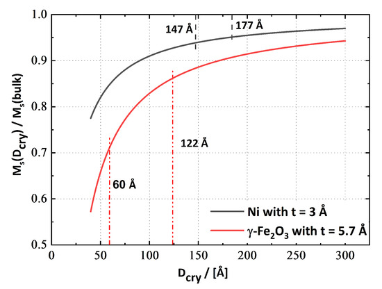 The influence of crystallite size on MS, according to [49], assuming a non-magnetic layer between adjacent crystallites of 5.7 Å for -Fe2O3 and 3 Å for Ni. Due to the smaller CSDS for -Fe2O3 the surface-to-volume ratio becomes larger, causing a stronger decrease of MS-Fe2O3.