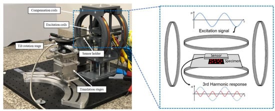 The excitation AC magnetic field was generated with a pair of Helmholtz coils. Another coil arrangement was utilized to apply a low-amplitude AC field and compensate for an unwanted background signal in the sensing area due to nonlinear excitation at the sensor’s resonance frequency. The essential power was supplied using the signal generator (RME Fireface UC) and an AC amplifier (PAS2002 audio AMP). For enhancing the signal-to-noise ratio (SNR), the sensor output response was amplified by a low-noise charge amplifier (CA). More details about the amplifier design and noise analysis can be found in our previous publication [27]. The sample positioning was controlled automatically via 2D XY-stage and linear step motors. Meanwhile, the sensor holder could be adjusted manually with different degrees of freedom, including tilt, rotation, and translation with a precise micrometer head. A schematic diagram of the electronic appliances has been demonstrated in Supplementary Data, Figure S1. As can be seen, all elements were controlled by the developed MPM controller, which was hosted on a computer with MATLAB software. In addition, data analysis was performed via the developed GUI evaluator program.