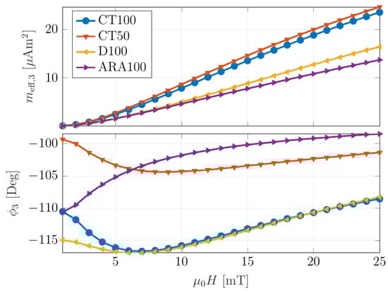This study uses the phase difference in the reconstruction procedure to distinguish between particle types. In this regard, differentiation in the phase of particle response is necessary. Magnetic particle spectrometry (MPS) was performed on the different MNP types to evaluate the phase and amplitude of particle response at 25 mg/mL concentration. MPS spectra were measured at 2.5 kHz for 10 mT, aligning with the readout scheme. The different types of superparamagnetic nanoparticles (magnetite core in citric acid matrix) that are specially designed for the MRI diagnostic were purchased from chemicell GmbH (Berlin, Germany). In the measurement scheme, the MNPs were excited with an alternating magnetic field at 2.5 kHz, roughly one-third of the resonance frequency of the ME sensor. Consequently, the third harmonic of the nanoparticle response at 7.5 kHz was measured. Figure 2 shows the effective magnetic moment response of the 3rd harmonic for different nanoparticles, including CT 50, CT 100, D100, and ARA 100. The MPS spectra can be found in Figure S2 (Supplementary Data).