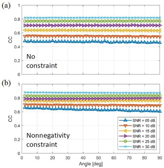 As colored imaging for MPM is reliant on the different phase responses of the particles, the effect of particle phase difference on the correlation coefficient is illustrated in Figure 4a,b. In the first condition, the nonnegativity constraint was not considered in the reconstruction whose result shows the amplitude of the complex values (Figure 4a). The projection operator is applied for the second case and is depicted in Figure 4b. As it can be seen in both Figure 4a,b, increasing the SNR will increase the CC factor and spatial accuracy. The result was expected since the data are less contaminated by noise.