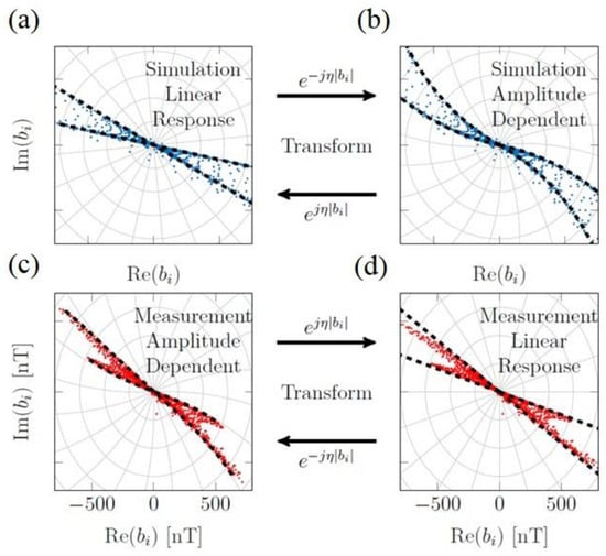 As can be seen in Figure 5a,b, the straight dashed lines are transformed into the curved form and indicate the amplitude-dependent phase. The measured signal for two MNP types is shown in Figure 5c,d. As indicated in Figure 5c, the phase values depend on the field amplitude to some extent. The independence of phase values is essential for the reconstruction procedure. To this end, the measured data were transformed to correct this effect. Figure 5d shows that after transforming, two straight lines can adequately enclose all of the measured points.