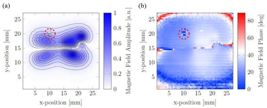 (a) Measured amplitude and (b) absolute value of the phase mod for the magnetic fields of the MNP distribution.