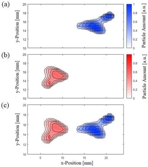 As indicated in Figure 7, a clear spatial separation was observed between the two particle types, and hence, the shown approach could be considered for developing practical colored MPM systems. It must be emphasized that the proposed method can only distinguish two different particles. The reconstruction of three particles could be possible based on measuring the third and fifth harmonic simultaneously.