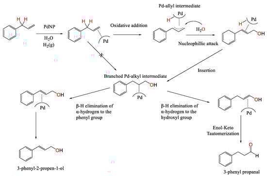 Following this step, the addition of the H2O to the less substituted carbon atom of the Pd-allyl intermediate would form cinnamyl alcohol. This then leads to the formation of a common branched Pd-alkyl intermediate, which can underdo β-hydride elimination at two different carbon centers. The abstraction of hydrogen α to the phenyl group would lead to the production of 3-phenyl-2-propen-1-ol (cinnamyl alcohol), which has often been observed as one of the major products for the C6-PdNPs. The removal of hydrogen α to the hydroxyl group results in an enol intermediate that can favorably tautomerize to form 3-phenylpropanal, which is a significant or major product for both PdNPs. Interestingly, the isomerization of cinnamyl alcohol to 3-phenylpropanal could be enhanced if the concentration of hydrogen is increased. Thus, the Pd-allyl pathway may account for the necessary presence of hydrogen gas to achieve significant aldehyde yields. Whatever the nucleophilic mode of addition may be, it is recognized that a common branched Pd-alkyl intermediate must be generated to produce 3-phenylpropanal and 3-phenyl-2-propen-1-ol.
