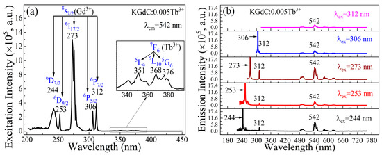 In the low Tb3+ doping concentration, the interactions between the emission ions are weak, and the transfer process of the excited state electrons is easily traced. Figure 3 shows the luminescence properties of KGdC:xTb3+ at x = 0.005. The efficiently excited wavelengths are clearly shown in Figure 3a for the 542 nm emission. On the excitation spectrum, the intense excitation peaks are located at 244, 253, 273, 306, and 312 nm, corresponding to the Gd3+ transitions from 8S7/2 ground state to 6D3/2, 6D9/2, 6I17/2, 6P5/2, and 6P7/2 excited states [11], respectively. Additionally, the weak excitation peaks are located at 351, 368, and 376 nm, corresponding to the Tb3+ transitions from 7F6 to 5L9, 5L10, and 5G6 [27,28], respectively. However, the intense peaks of the entire exciting spectrum mainly consist in the absorption of Gd3+, which indicates a high transfer efficiency from Gd3+ to Tb3+. The contribution of Gd3+ is indicated by the emission spectra in Figure 3b. Under the excitations of 244, 253, 273, and 306 nm, most of the Gd3+ excited state electrons could transfer to Tb3+ with the typical luminescence emission of 542 nm. Another typical emission of Gd3+ at 312 nm could be observed in all spectra, which indicates that a fraction of high excited state electrons could depopulate to ground state through the 6P7/2 intermediate excited state.