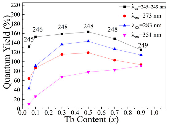 Quantum Yields of KGdC:xTb3+ under different excitation wavelengths.