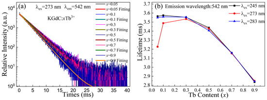 Figure 7a shows the decay curves of KGdC:xTb3+ under excitation at 273 nm. The electronic depopulation of the 5D4 level is characterized by the decay curve. As shown in the figure, all decay curves could be fitted by the single exponential. The fitted lifetimes mainly originate from the decay process of excited state electrons at the 5D4 level. The values of a lifetime were shown in Figure 7b. In the excitation at 273 nm, the lifetime values of the 5D4 level first increase and then decrease with an increasing Tb3+ concentration. The dramatic change originates from the competition between the 6I17/2 (Gd3+) and 5F3 (Tb3+) levels. The lifetime value is small in a small number of Tb3+. When the Tb3+ doping concentration is increased, the energy transfers between Gd3+ and Tb3+ are efficiently enhanced [38]. The lifetimes increase with the increasing number of excited state electrons. When x is larger than 0.3, the high concentration of Tb3+ improves the cross-relaxation efficiency between two Tb3+. The rapid accumulation of excited state electrons decreases the energy lifetime of the 5D4 level. As for the excitation at 245 and 283 nm, there are two lower excitation intensities for the 312 nm emissions than that of 273 nm in low Tb3+ doping concentration (as shown in Figure 4a). The competition of excited state electrons between Gd3+ and Tb3+ is weak. The Gd3+ emission consumes a small number of excited state electrons, which results in a slight reduction in lifetime. When the Tb3+ doping concentration is further increased, the lifetime decreases rapidly in a shortened distance between Tb3+ ions [39].