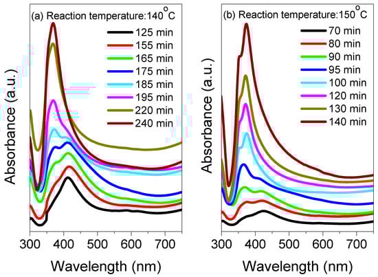 Figure 2. The absorbance of AgNWs suspension for the growth duration in the range of (a) 125–240 min at a reaction temperature of 140 °C, and (b) 70–140 min at a reaction temperature of 150 °C.