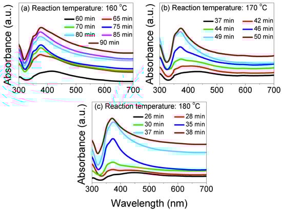 Figure 3. The absorbance of AgNWs suspension for the growth duration in the range of (a) 60–90 min at a reaction temperature of 160 °C, (b) 37–50 min at a reaction temperature of 170 °C, and (c) 26–38 min at a reaction temperature of 180 °C.