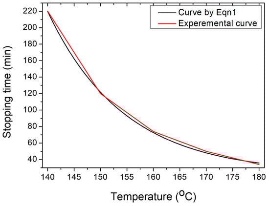 Figure 4 displays the measured growth time against the growth temperature of AgNWs in the suspension (red) fitted to Equation 1 (black). The obtained perfect match between the experimental and theoretical curves clearly indicated the exponential decay of the growth time (t(T)) with the temperature (T), given by: