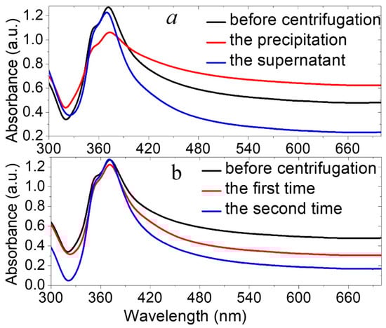 Figure 5. The absorption spectra of AgNWs (grown at 150 °C) during the purification process: (a) before the centrifuge, and the supernatant and precipitation after the centrifuge at 1500 rpm. (b) before the centrifuge, and centrifugation of supernatant twice at 7000 rpm.