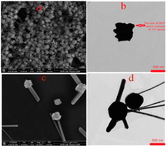 Figure 6. (a,c) are FESEM images of AgNPs and AgNRs suspensions grown at 140 °C for 125 min and 175 min, respectively, and the corresponding (b,d) are their TEM images.