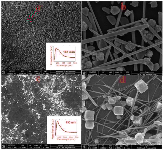 Figure 7. (a,c) are FESEM images of AgNPs, AgNRs, and AgNWs suspensions grown at 140 °C for 185 min and 195 min, respectively, and the corresponding (b,d) are their FESEM images with a magnification of 50kx.