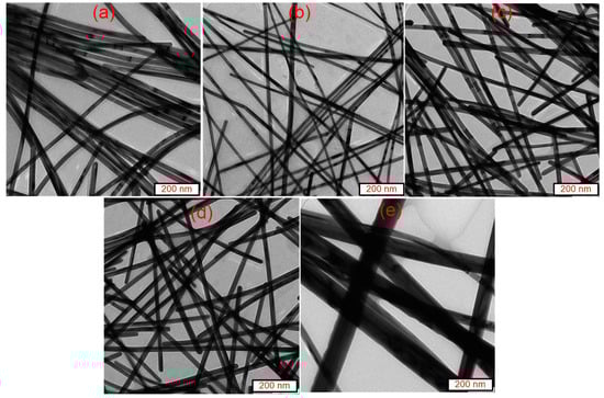 Figure 8. TEM images of AgNWs suspension at the growth time for growth temperature: (a) 140, (b) 150, (c) 160, (d) 170, and (e) 180 °C.