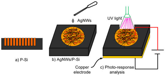 Figure 10. Schematic diagram of (a) the fabricated P-Si photodetector, (b) the AgNWs/P-Si photodetector, and (c) the photo-response analysis.