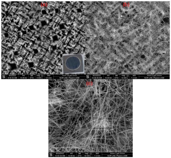 In this work, the synthesized AgNWs were used to enhance the detectivity of the porous Si to the UV irradiation at a wavelength of 375 nm with different bias voltages of 1 V, 2 V, 3 V, and 4 V. Due to the high transparency, high conductivity, and plasmonic properties of the AgNWs, the photo response of the porous Si (P-Si) photodetector increased dramatically from the μ A range to the mA range. A porous silicon (P-Si) structure was formed on the Si (n-type) by electrochemical etching. The FESEM images of the AgNWs/P-Si are displayed in Figure 11a with three different magnifications of 5kx, 10kx, and 50kx. The findings confirm that the etching of the n-type Si by the electrochemical process was successful in producing the porous structure over the Si. As shown in the figure, the pores and the Si are indicated by dark and bright colors, respectively. The formation of a uniform distribution of the PSi structure over the surface of the silicon substrate was confirmed by the observation of many pores with a high density. P-Si, including its large surface-to-volume ratio, high absorbance spectrum, and wide energy gap, in comparison to the bare Si, is a promising and suitable material for a photodetector [31,32,33]. Figure 11 shows FESEM images that investigate the surface morphology of the high-purity AgNWs network that was evenly distributed on the P-Si structure. The high purity of AgNWs is due to the abovementioned efficient purification process.