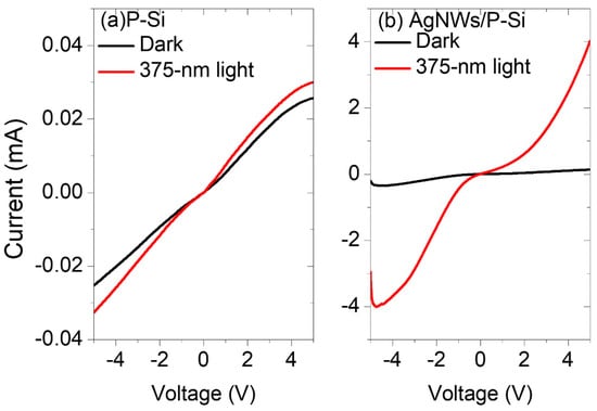 Figure 12. Current-voltage curves of the (a) P-Si and (b) AgNWs/P-Si photodetector under dark and 375 nm light.