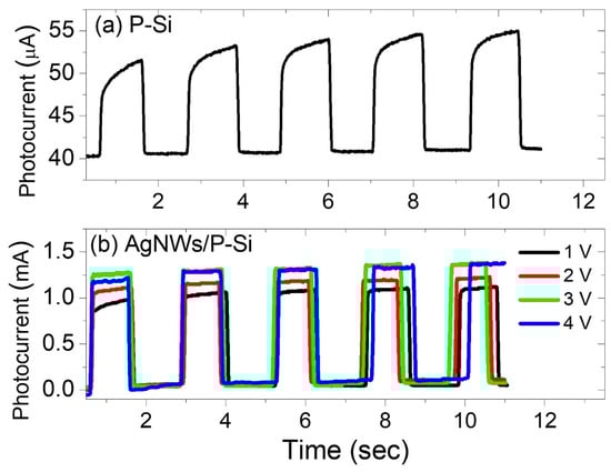 Figure 13. The photocurrent versus time of (a) porous Si and (b) AgNWs/porous Si photo-sensors for four bias voltages of 1 V, 2 V, 3 V, and 4 V.