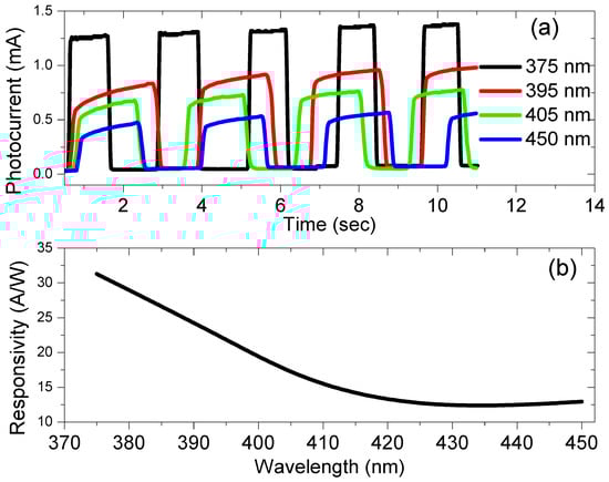 Figure 15a shows the photocurrent versus the time of the AgNWs/P-Si photodetector for four different wavelengths: 375 nm, 395 nm, 405 nm, and 450 nm. It is observed that the photocurrent of the AgNWs/P-Si photodetector decreases with the increase in the wavelength, since the photocurrent decreased from 1.37 mA at a wavelength of 375 nm (UV light) to 0.566 mA at a wavelength of 450 nm (blue light). The responsivity of the photodetector due to the four wavelengths was calculated and then plotted versus the wavelength, as shown in Figure 15b. The figure indicates that the responsivity decreases when we go to visible light.