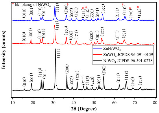 where D is the crystallite size, is the characteristic wavelength of the X-ray, represents the angular width in radian at an intensity equal to half of its maximum of the peak, and is the diffraction angle. The average particle sizes of the ZnWO4, NiWO4, and ZnNiWO4 NPs were 14.43, 15.81, and 13.67 nm, respectively; they were calculated by using Equation (1) and are given in Table 1.