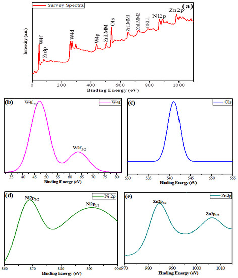 To study the chemical status and elemental composition of ZnNiWO4 NPs further, samples were investigated by X-ray photoelectron spectroscopy (XPS). The survey spectra, given in Figure 7a, revealed the elemental composition of NPs consisting of Zn, Ni, W, and O elements. To further evaluate the chemical status of elements in the crystal structure, high-resolution spectra for W 4f, O 1s, Zn 2p, and Ni 2p of ZnNiWO4 were also recorded (Figure 7b–e). Figure 7b consists of the W4f spectrum, which shows two spin-orbit doublets with peaks at 47.30 eV and 63.77 eV, representing the W 4f7/2 and W 4f5/2 belonging to the W6+ chemical state, respectively [36]. The O1s spectrum in Figure 7c resulted in a single broad peak at 541.03 eV, representing the oxygen coordination with Zn–O, W–O, and Ni–O, respectively [37]. Figure 7d displays the two major peaks at 868.95 eV and 890.71 eV, assigned to Ni 2p3/2 and Ni 2p1/2 spin-orbit peaks with their corresponding shake-up satellites. The Gaussian deconvolution of the Ni 2p3/2 line belonged to Ni2+ in the Ni (OH)2 peaks, while the Ni 2p1/2 line belonged to the Ni2+ ions, respectively [38]. The Zn 2p spectrum (Figure 7e) of ZnNiWO4 showed two peaks at 984.83 eV and 1006.40 eV, which were respectively attributed to Zn 2p1/2 and Zn 2p3/2 and suggested the presence of Zn2+ ions [39].