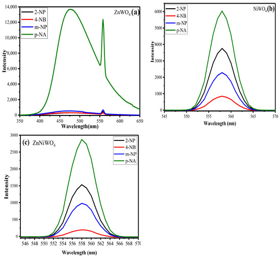 The fluorescence-sensing properties of ZnWO4, NiWO4, and ZnNiWO4 for NACs, such as 2-nitrophenol (2-NP), 4-nitrobenzaldehyde (4-NB), m-nitrophenol (m-NP), and p-nitroaniline (p-NA), were investigated with methanol as a solvent medium. As shown in Figure 9a–c, strong emission peaks at 473 nm at 320 nm excitation wavelength were observed for p-NA by ZnWO4, NiWO4, and ZnNiWO4 in a methanol environment, which suggested that p-NA was most comprehended by metal tungstate and mixed metal tungstate nanoparticles. This phenomenon could have been caused by the hydrogen bond and the strong radiative transitions between tungsten and oxygen within the (WO6)6− molecular complex [36,41]. The order of detection was found to be p-NA > 2-NP > m-NP > 4-NB. Therefore, p-NA was chosen for further experimental analysis.