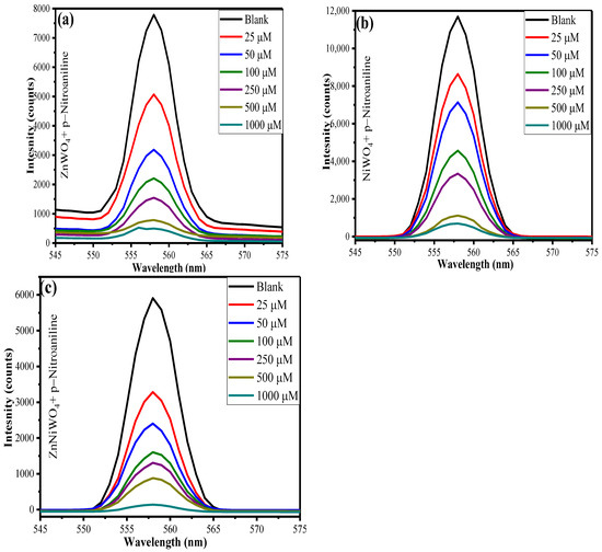 To explore the fluorometric detection ability of synthesized ZnWO4, NiWO4, and ZnNiWO4 NPs dispersed in methanol towards p-NA, fluorescence titrations were performed with an incremental concentration of p-NA from 25 μM to 1000 μM. It was seen (Figure 10a–c) that, with increase in concentration of p-NA, there was a slight decrease in the fluorescence intensity of the synthesized nanoparticles, suggesting an efficient quenching effect. The fluorescence quenching efficiency can be calculated by using [(F0 − F)/F0] × 100%, where F0 is the initial fluorescence intensity of dispersed nanoparticles in methanol and F is the fluorescence intensity in the presence of p-NA. The quenching effects for ZnWO4, NiWO4, and ZnNiWO4 NPs were found to be 93%, 94%, and 98%, respectively. The experiment showed that nitroaromatic compounds exhibited a stronger quenching effect, which was ascribed to the strong electron-withdrawing NO2 group [2,3,42]. Therefore, the mixed metal tungstate nanoparticles showed an improved quenching effect towards a higher concentration of p-NA as compared to its precursor.