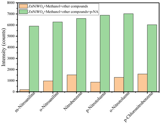 The anti-interference capability of the synthesized nanocomposite sensor ZnNiWO4 was tested by comparing the PL intensities with p-NA and its analogs such as m-nitroaniline, o-nitroaniline, nitrobenzene, p-nitrotoluene, o-nitrotoluene, and p-chloronitrobenzene. The obtained results are given in Figure 12, in which the first column represents the PL intensity of the interfering agent (25 μM) with ZnNiWO4 and the second column represents the PL intensity of the interfering agent (25 μM), p-NA (50 μM) with ZnNiWO4 in a methanol environment. It can be seen from the results that the presence of interfering agents had no effect on the sensing capability of ZnNiWO4 towards p-NA, which suggested that the synthesized nanomaterial had a very good selectivity and sensitivity for p-NA.